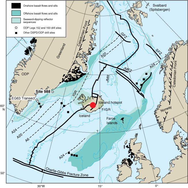 Geologic map of the North Atlantic showing main physiographic features of the region, selected Deep Sea Drilling Project (DSDP) and Ocean Drilling Program (ODP) drill sites, distribution of seaward dipping reflector sequences, outcroppings of Tertiary flood basalts, and locations of main seafloor spreading anomalies. GFZ = Greenland Fracture Zone, SFZ = Senja Fracture Zone, JMR = Jan Mayen Ridge, IGR = Iceland-Greenland Ridge, FIGR = Faeroe-Iceland-Greenland Rise.